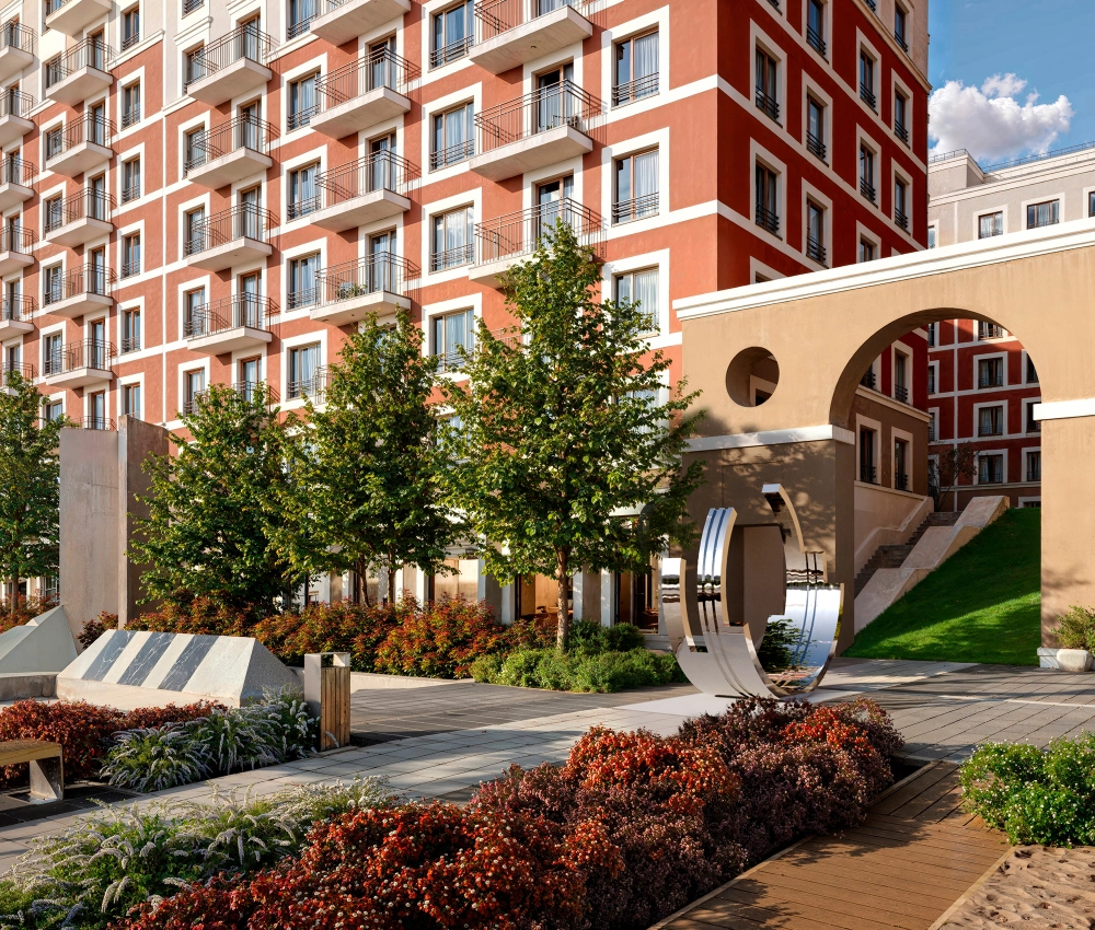 Монолитно-каркасный дом переменной этажности с надземным паркингом в стилобате, кладовыми помещениями, закрытым двором без машин, детскими и спортивными площадками.