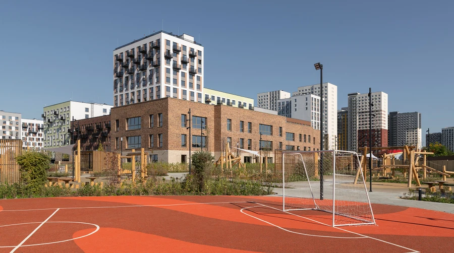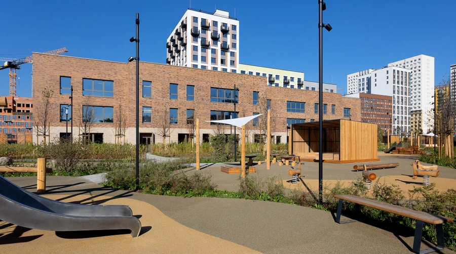В «Первом квартале» Видного Московской области начал работать новый детский сад на 280 малышей в возрасте от полутора до семи лет. Проект дошкольного учреждения разработали архитекторы «Брусники» в партнёрстве с голландским бюро.